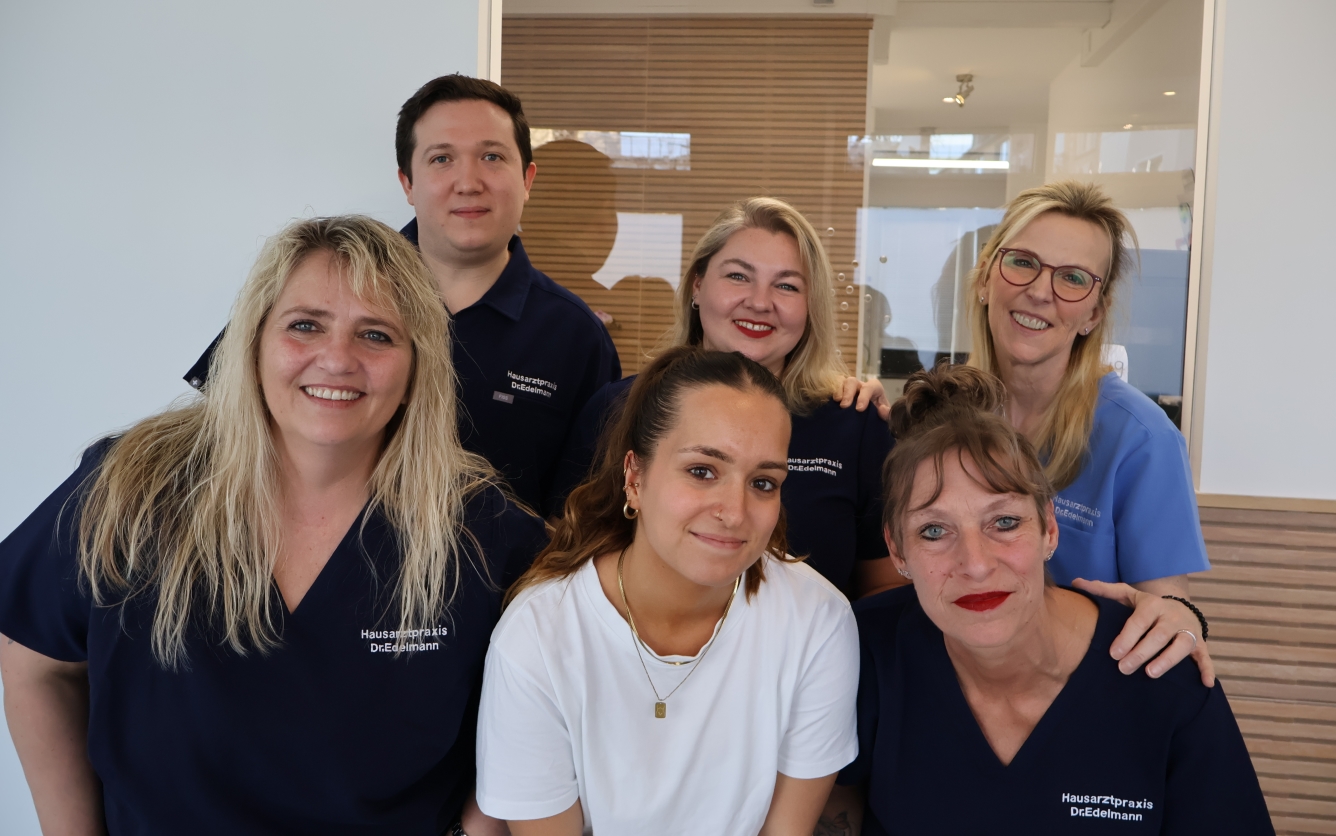 Das Praxisteam der Sucht- & Hausarztpraxis Koblenz Mitte (v.l.n.r.): Sandra Wirtz, Carlos Gamboa, Emilia Linke, Xenia Dudkiewicz, Melanie Brauner und Dr. med. Inka Edelmann.
